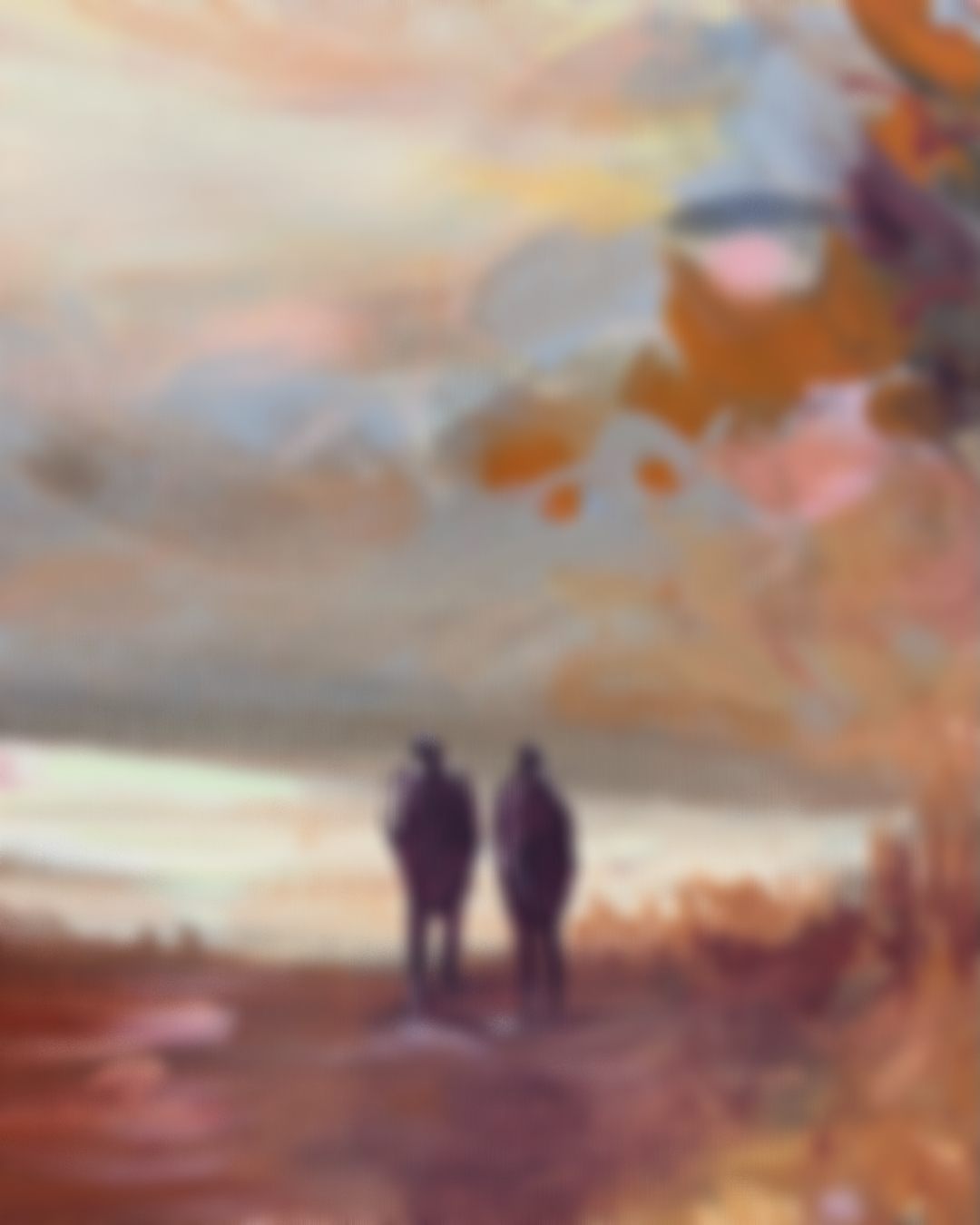 Im Zentrum entdeckst du zwei kleine Silhouetten, die Seite an Seite ihren Weg gehen.