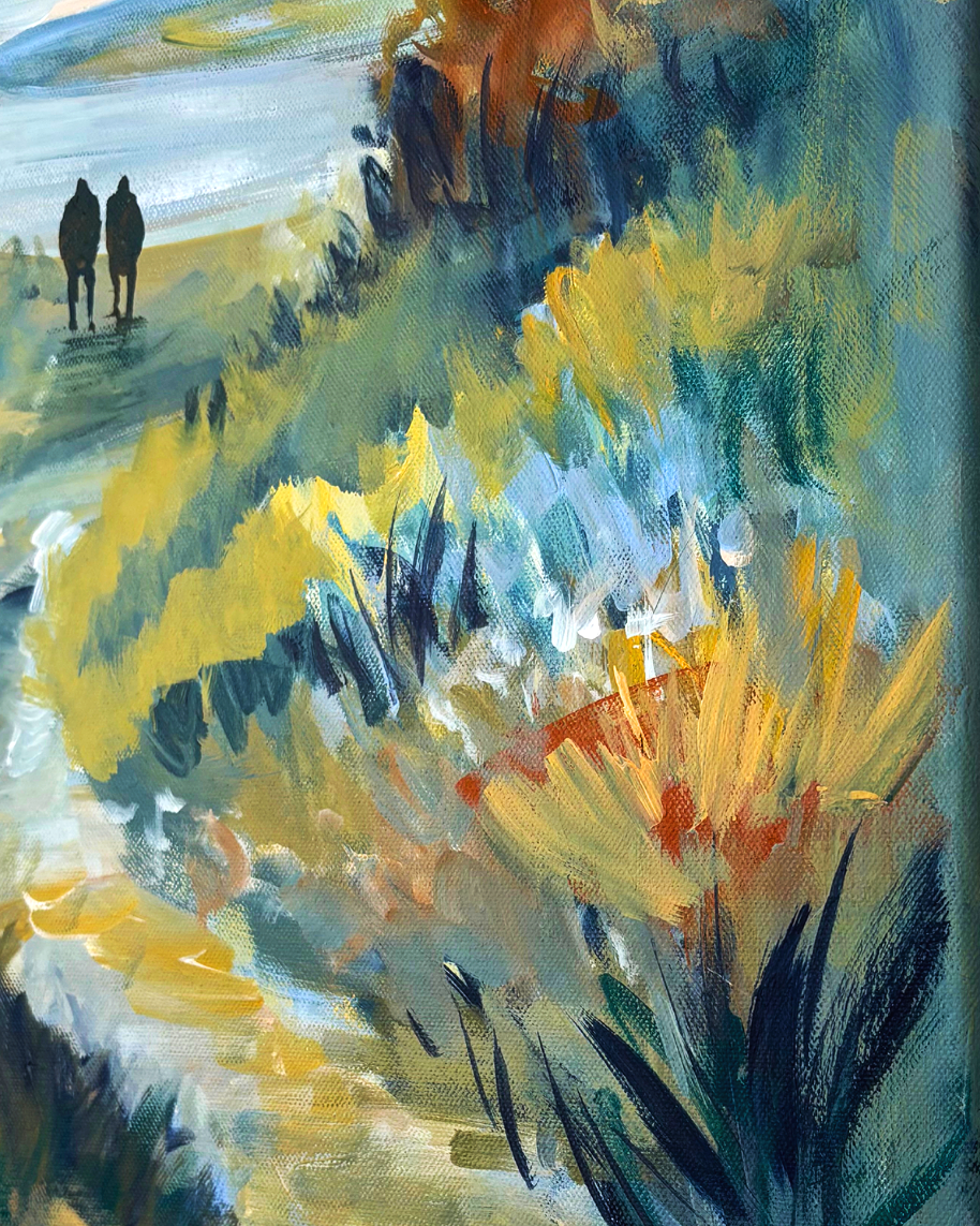 Im Zentrum entdeckst du zwei kleine Silhouetten, die Seite an Seite ihren Weg gehen.