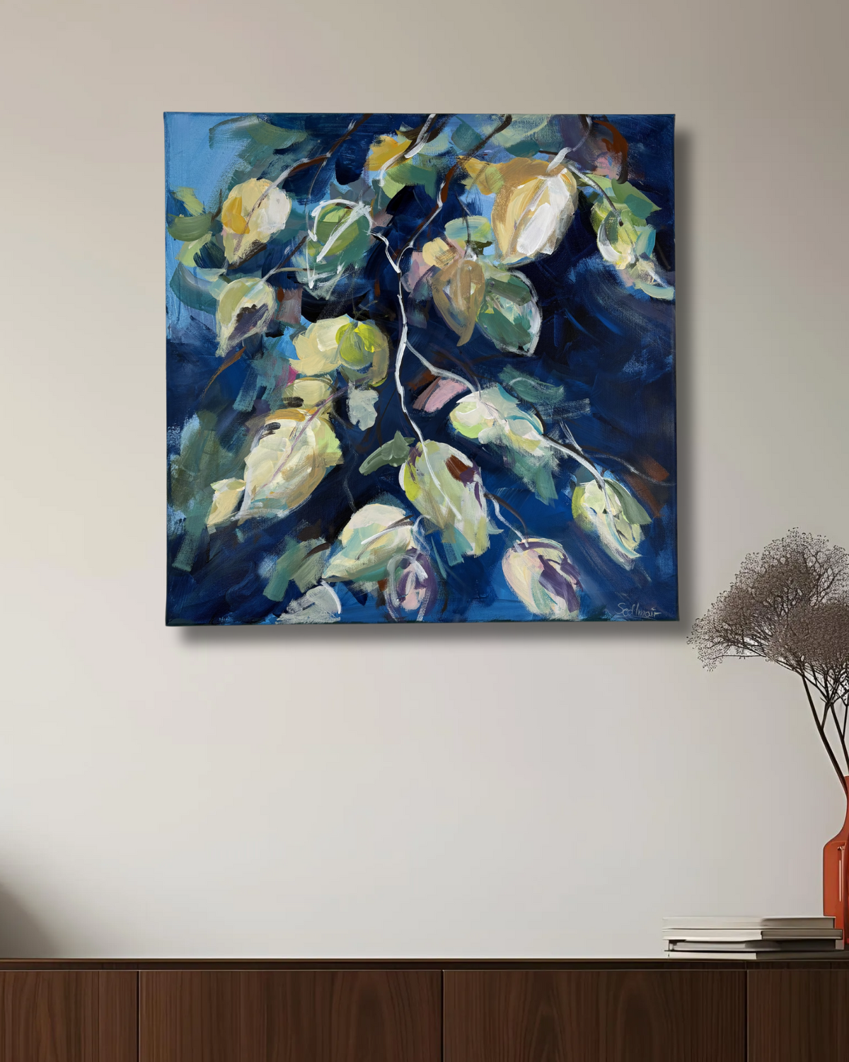 "Unsicher, wie das Kunstwerk in Deinen Raum passt? Ich biete eine virtuelle Vorschau, mit der Du sehen kannst, wie das Kunstwerk in Deinem Zuhause aussehen wird, bevor Du dich entscheidest."